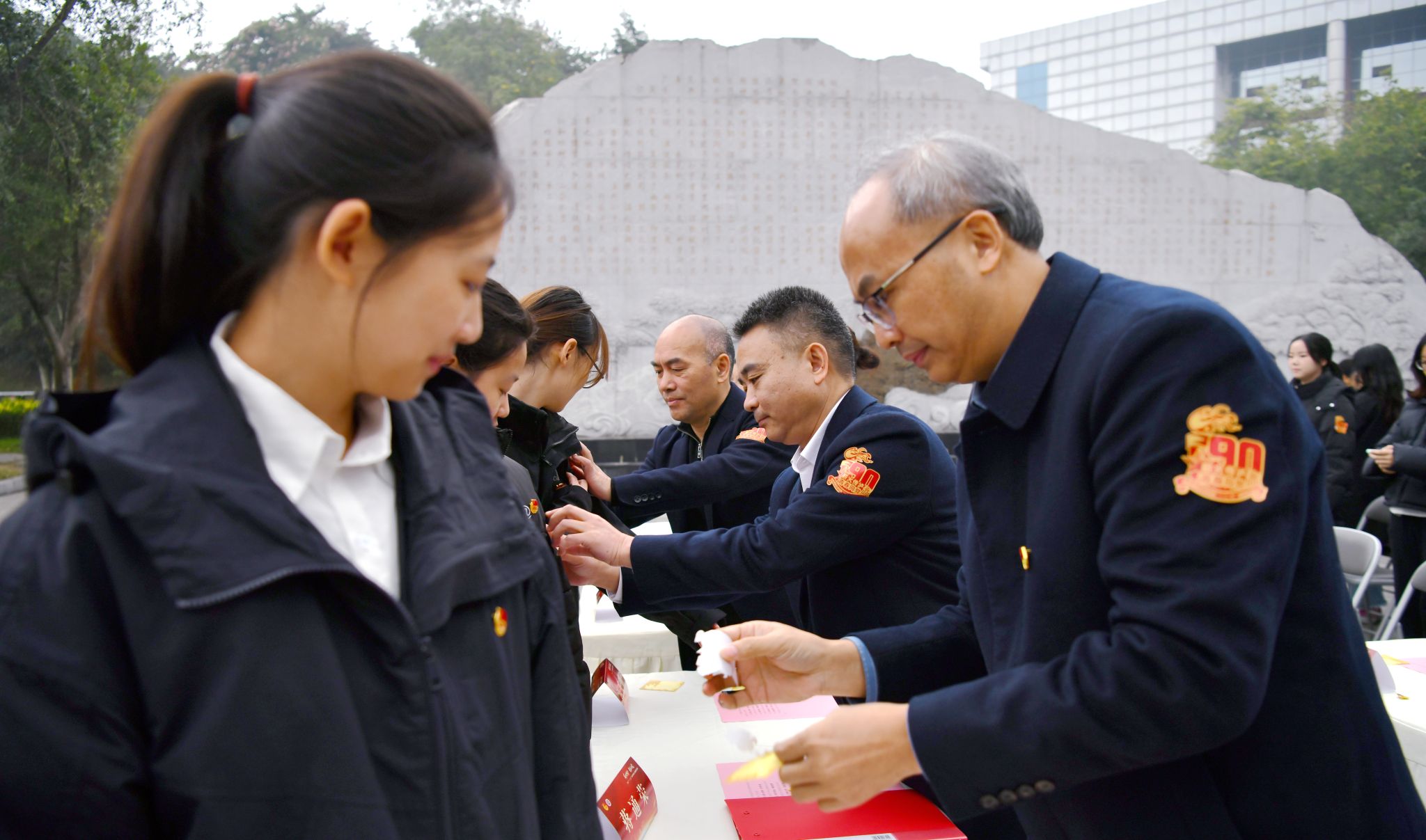 随后,老师们为新团员代表佩戴 “初心肩章”,红星与蛇杖图案承载先辈嘱托与医者使命,新团员庄严承诺传承红色基因。