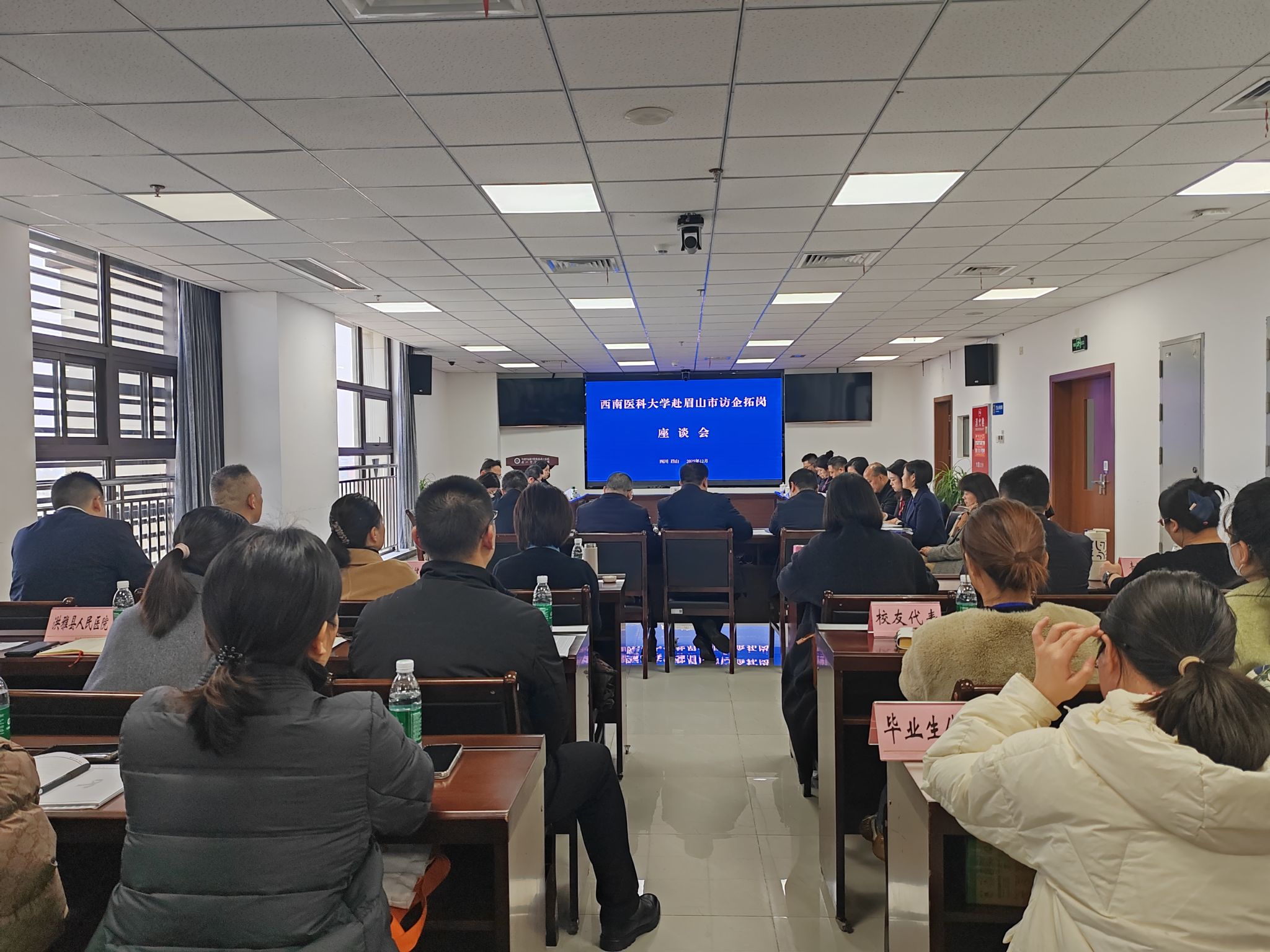 座谈会上,眉山天府新区社会事务局、洪雅县卫健局介绍了本地引才政策与人才队伍建设情况;眉山市中医医院、彭山区人民医院结合发展需求,详解人才引进政策与岗位缺口。校友代表分享了在眉山的工作成长经历。双方围绕医学人才培养、实习实训、科研协作及毕业生就业等议题深入交流,达成人才共育、资源共享、发展共赢的合作共识。