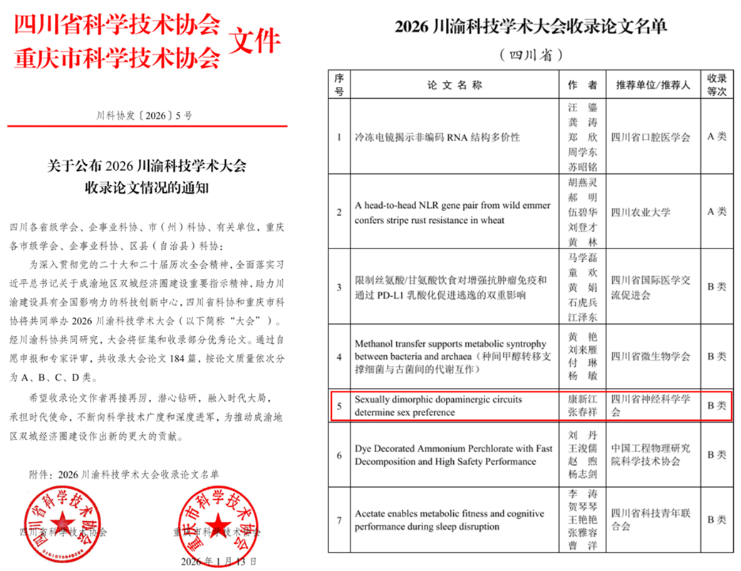 近日,在2026年川渝科技学术大会收录论文评选活动中,康新江与张春祥于2025年合作发表于《Science》的论文《Sexually dimorphic dopaminergic circuits determine sex preference》,从众多参评论文中经过严格评审,成功入选大会收录的184篇获奖论文,并荣获B类优秀论文(其中A类4篇,B类20篇,C类与D类合计160篇)。