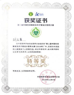 11月4日,由中国营养学会主办,中国营养学会妇幼分会承办的“第二届妇幼膳食及月子餐设计营养大赛”颁奖大会在杭州举行。kaiyun官网公共卫生学院研究生胡吉蕾在教授谢惠波的指导下荣获“学龄前儿童膳食”组唯一一个特等奖。