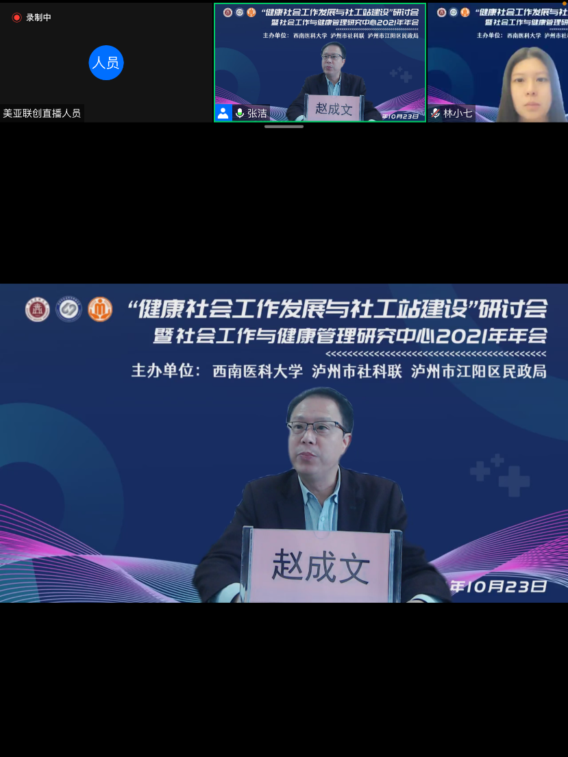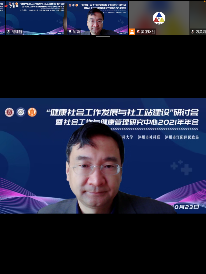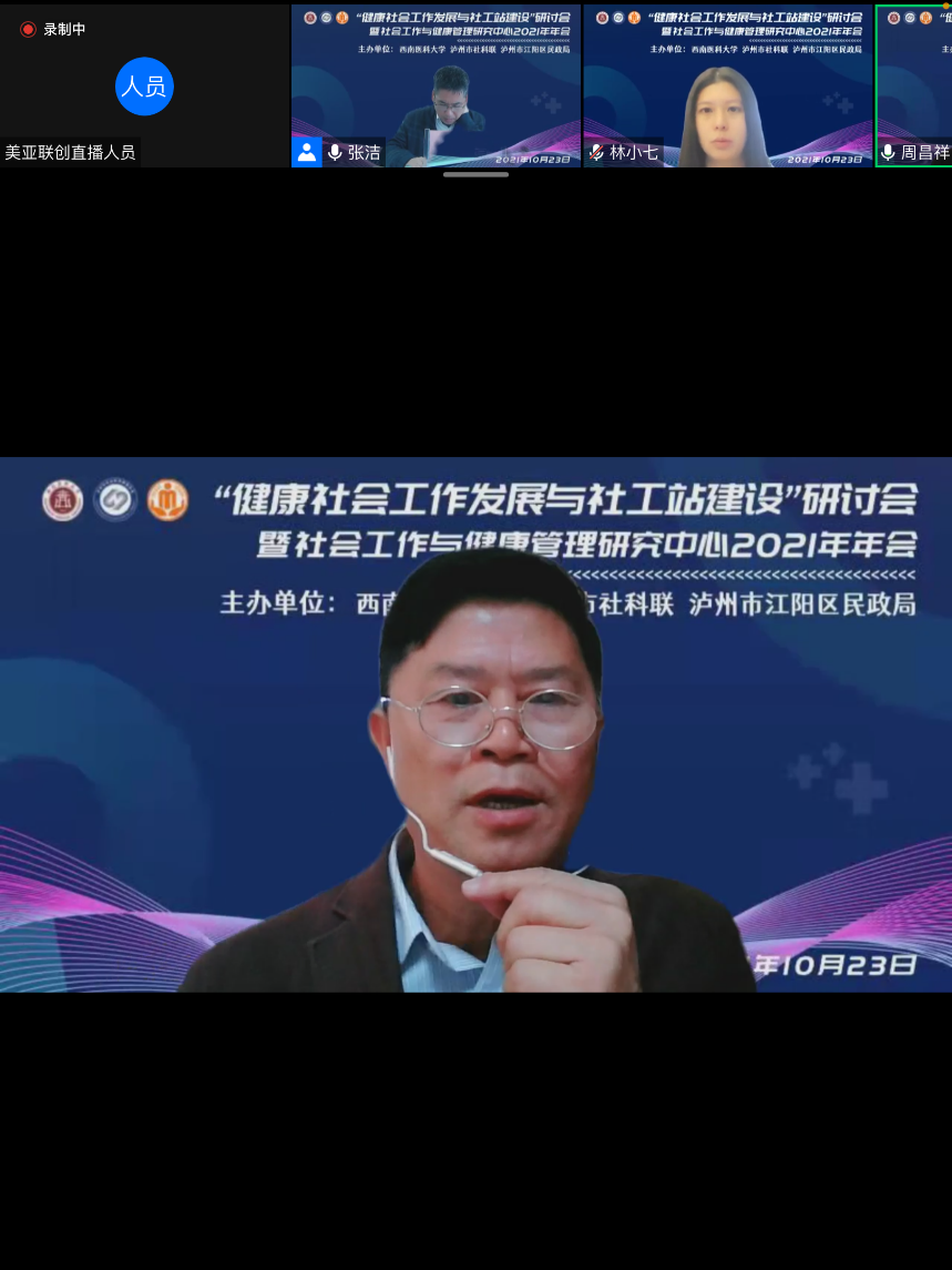 10月23日,以“健康社会工作发展与社工站建设”为主题的社会工作与健康管理研究中心2021年年会通过美亚平台在线举行。来自北京大学、重庆工商大学、湖南师范大学等高校的社会工作领域知名专家以及来自高校、民政系统、社会组织、医疗系统等领域的1000多人参加了此次线上会议,观看累计达4000多人次。会议分为开幕式和主题报告两个部分。