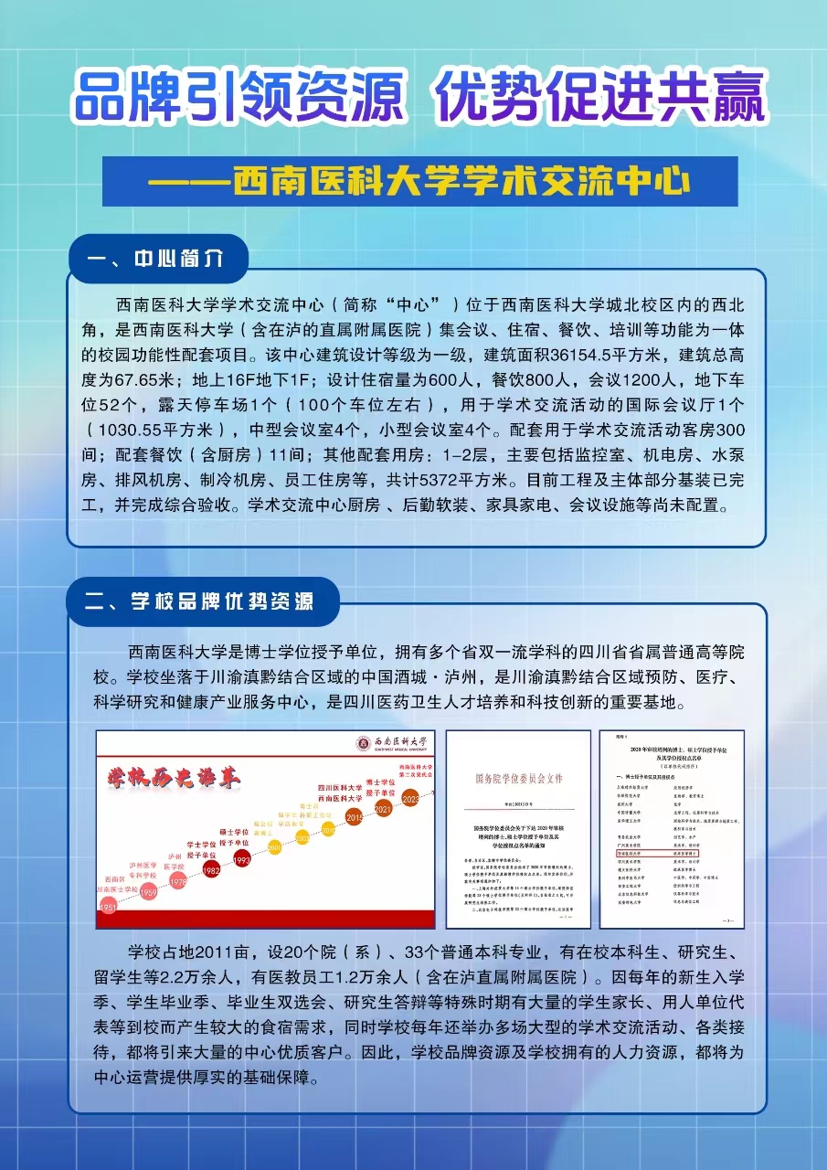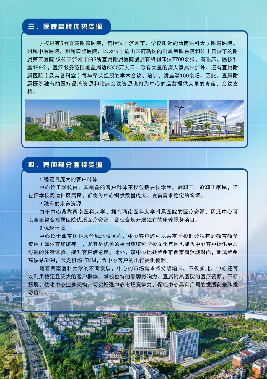 学校现有5所直属附属医院,包括位于泸州市、学校附近的kaiyun官方网站入口附属医院、附属中医医院、附属口腔医院,以及位于眉山天府新区的附属第四医院和位于自贡市的附属第五医院;仅位于泸州市的3所直属附属医院就拥有编制床位7700余张,有临床、医技科室156个,医疗服务范围覆盖周边6000万人口。除有大量的病人家属来泸外,还有直属附属医院(及其各科室)每年牵头组织的学术会议、培训、讲座等100余场。因此,直属附属医院独有的医疗品牌资源和临床会议资源也将为中心的运营提供大量的食宿、会议支持。