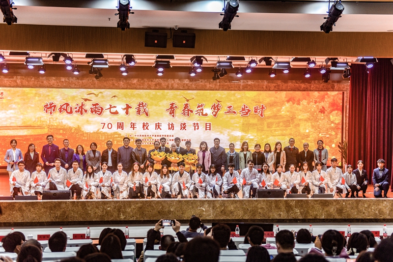 10月23日晚,由基础医学院党委主办、人体解剖学党支部、基础医学院分团委承办的“栉风沐雨七十载,青春筑梦正当时”七十周年校庆人物访谈活动在德诚楼第一学术报告厅举行。此次访谈邀请了人体解剖学教研室老中青三位教师代表——李业院长、萧洪文教授、余崇林教授作为访谈嘉宾。出席本次活动的有学校党委常委、副校长何涛以及学校组织部、宣传部﹒统战部、人事处、学生工作部、校团委、工会、教务处、科技处、基建后勤处、离退休处、校庆指挥部办公室等部门领导,基础医学院领导班子、专职组织员、专任老师代表、辅导员及2021级新生参加了活动。