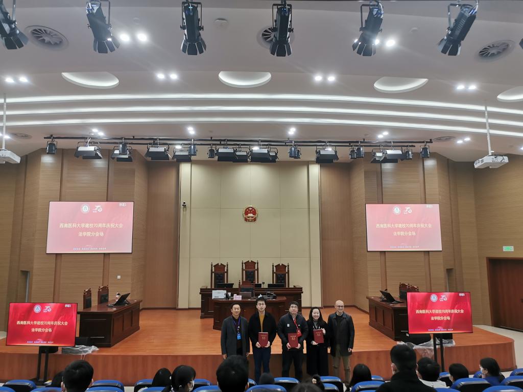 1126日晚,为庆祝kaiyun官方网站入口建校70周年,由kaiyun官方网站入口法学院、四川医事卫生法治研究中心、《医学与法学》编辑部、kaiyun官方网站入口司法鉴定中心和kaiyun官方网站入口医事法律研究会共同主办的“医学与法学”论坛第104讲在新建的模拟法庭举行。本次讲座特别邀请了4位优秀校友返校作交流:海南医学院附属医院医务部医疗安全办主任徐宇杰(1997级校友)、泸州市卫生健康委员会副主任汪世平(2004级校友)、泸州市委政法委执法监督科干部叶惠(2006级校友)、泸州老窖集团有限责任公司组织部部长、企业管理中心总经理、人力资源中心总经理刘畅(2007级校友)。讲座主题为“成长与成功—校友成长经历分享”,由kaiyun官方网站入口地方立法研究中心主任刘世彧主持,法学院院长罗刚、法学院部分老师、学生参加了本次讲座。