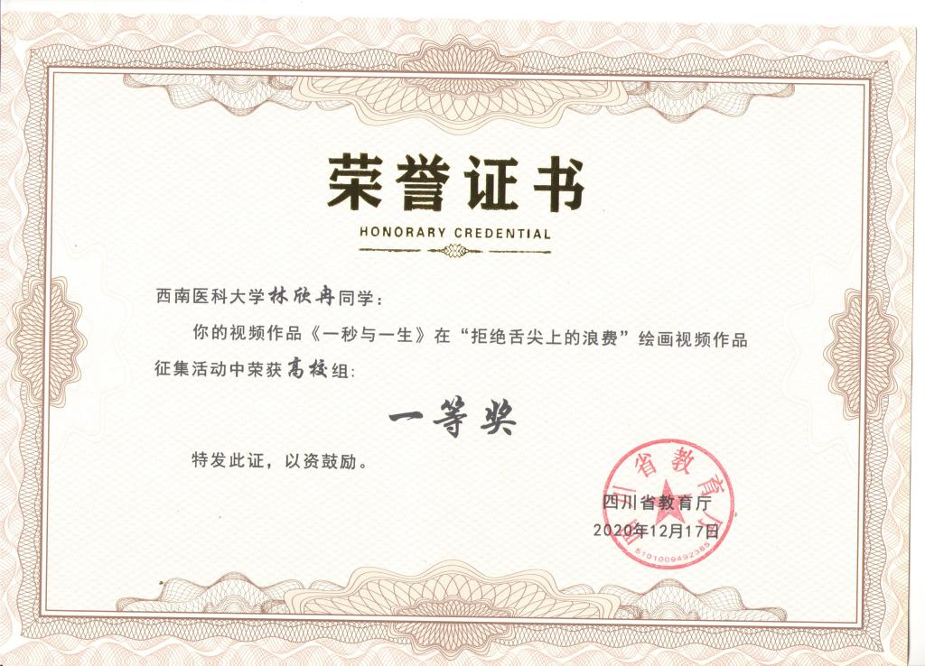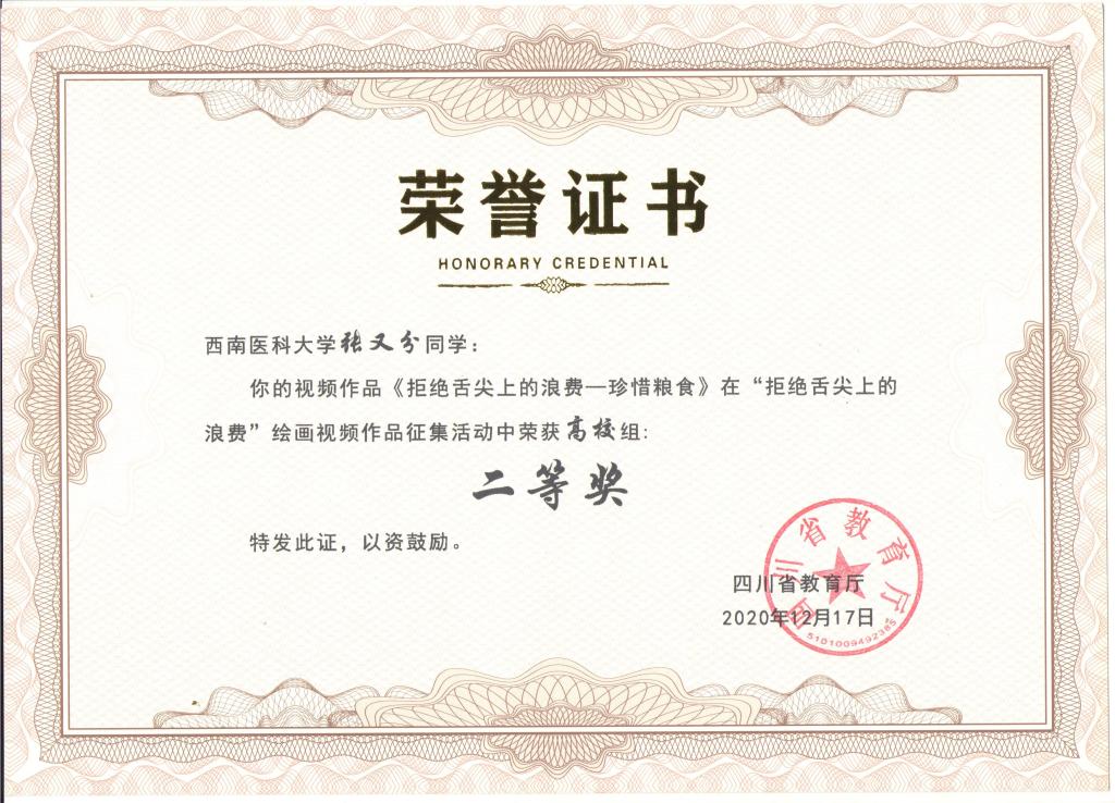 为引导师生摒弃落后的饮食观念,树立“厉行节约、反对浪费”的良好社会风气,四川省教育厅举办了一届“拒绝舌尖上的浪费”绘画视频作品征集活动,各地各校踊跃投稿,经各市(州)教育行政部门和高校初选推荐,共收到投稿作品 615 件,其中高校视频作品 86 件。kaiyun官网积极参与,精心筹备,报送的作品《一秒与一生》、《拒绝舌尖上的浪费-珍惜粮食》分别获得教育高校组一等奖和二等奖,kaiyun官网荣获优秀组织奖。