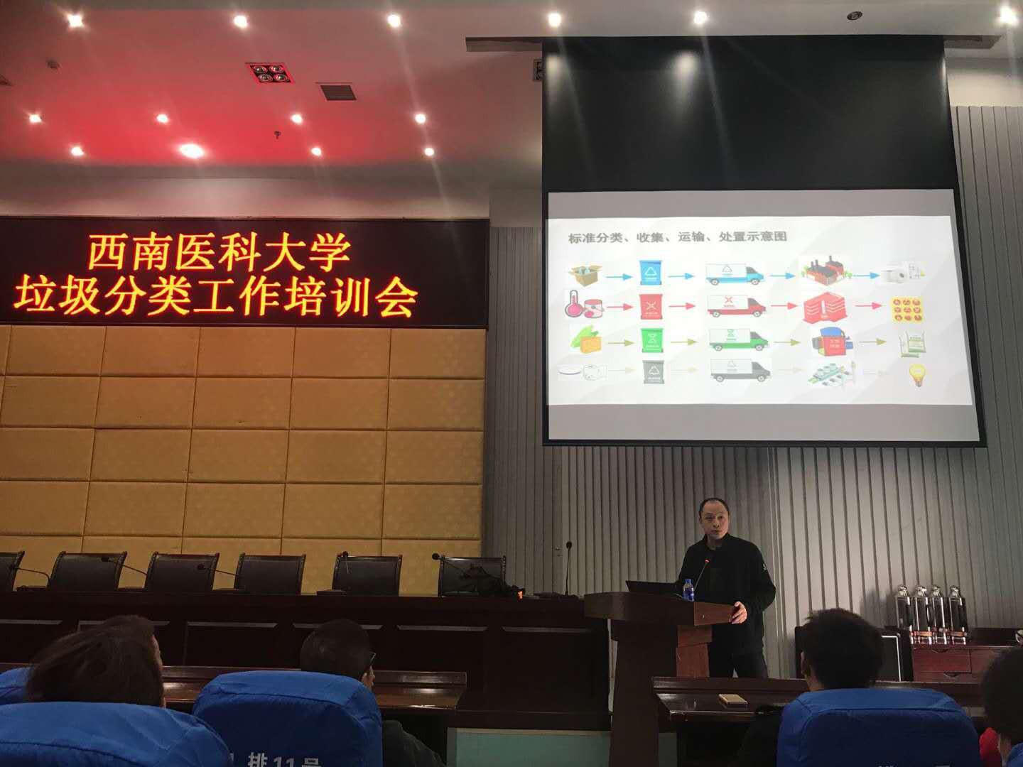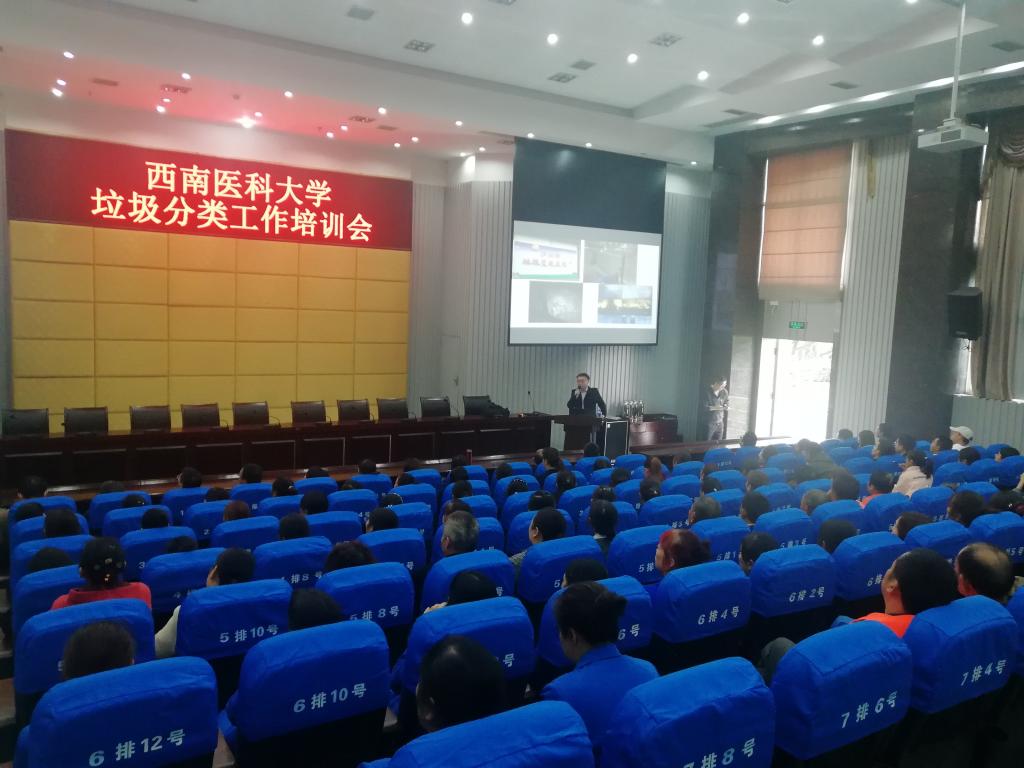 为进一步贯彻落实党的十九大精神,推进和谐校园、生态校园、文明校园建设,引导全校师生树立绿色低碳、环保健康的生活理念。近日,学校举办垃圾分类培训工作会,泸州“绿芽”垃圾分类高校联盟金牌讲师魏铭应邀作了《垃圾分类就是新时尚》专题培训,基建后勤处副处长陈勇主持,基建后勤处相关处科级干部、从事与环保工作相关的各级工作人员、全校各院系主要学生干部、公共卫生学院学生以及主动参与培训的师生参与培训工作会。