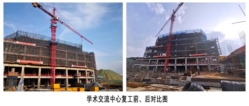 复工以来,施工单位撸起袖子加油干,每天奋战在工地上的建筑工人约730余人,在这38天内建设成果明显:最早复工的学术交流中心完成两层主体浇筑;药学大楼、体育馆等每个子项平均完成一层半主体浇筑;大学生活动中心、人文大楼完成二次结构、砖砌体约二层;科技大楼室内安装完成约10%,累计完成47%。