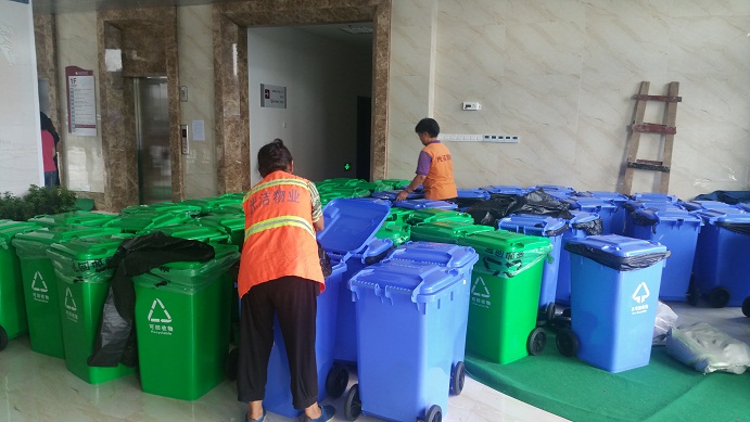 (物业公司人员分放垃圾桶)