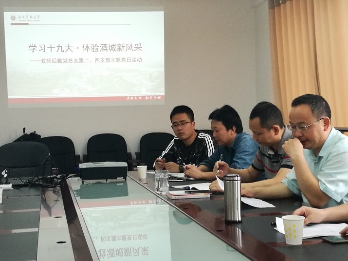 5月24日下午,教辅后勤党总支第二(能源维修)、四支部(校医院)联合开展了“学习十九大●体验酒城新风采”主题党日活动,支部全体党员、入党积极分子及后勤处科级干部参加了活动,活动分政治理论学习和酒城新风采现场体验两阶段进行。
