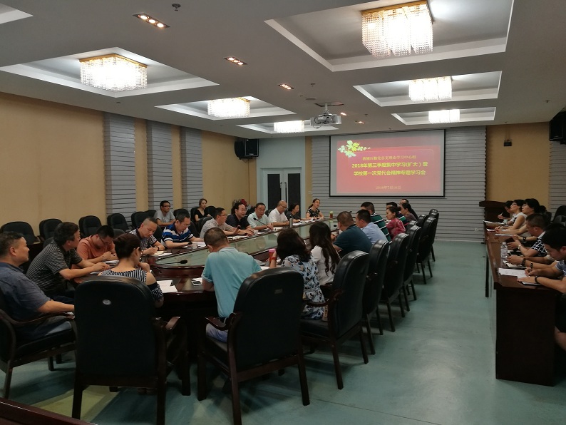 7月10日下午,教辅后勤党总支理论中心组2018年第三季度集中学习(扩大)暨学校第一次党代会精神专题学习会在逸夫图书馆底楼第五会议室召开,党总支委员、处科级干部、支部书记等30余人参加,学校党委常委、副校长聂敏海教授应邀出席。会议由党总支书记陈家良主持。