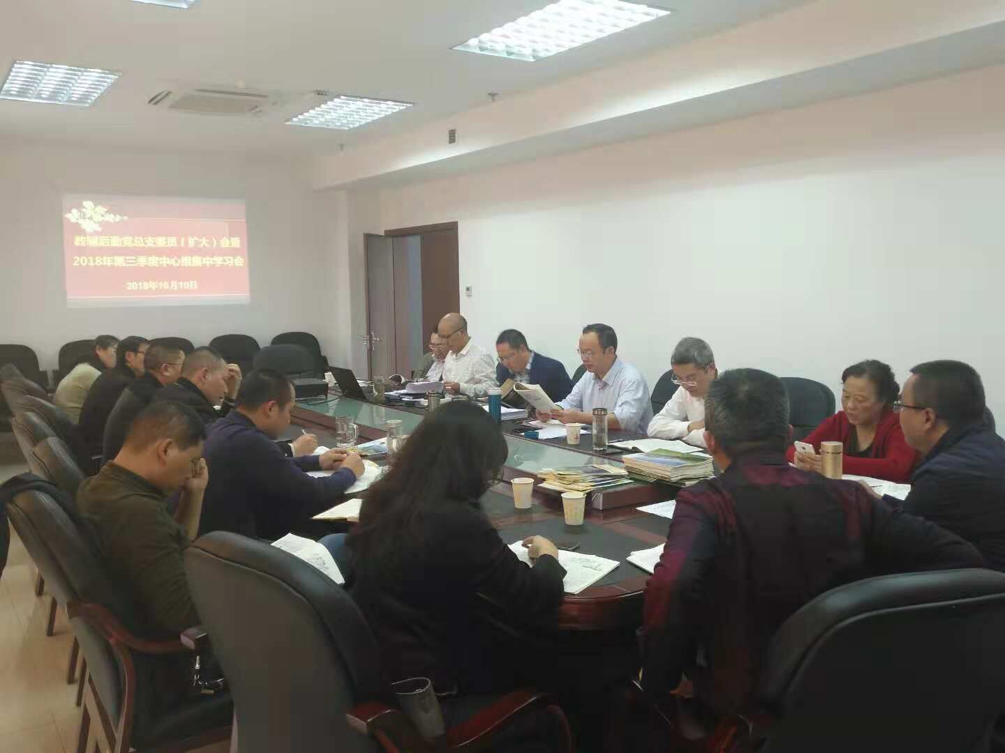 10月10日下午,教辅后勤党总支在德诚楼412会议室召开总支委员(扩大)会暨2018年第三季度第二次中心组集中学习会,党总支委员、部门主要负责人、支部书记参加。会议由党总支书记陈家良主持。