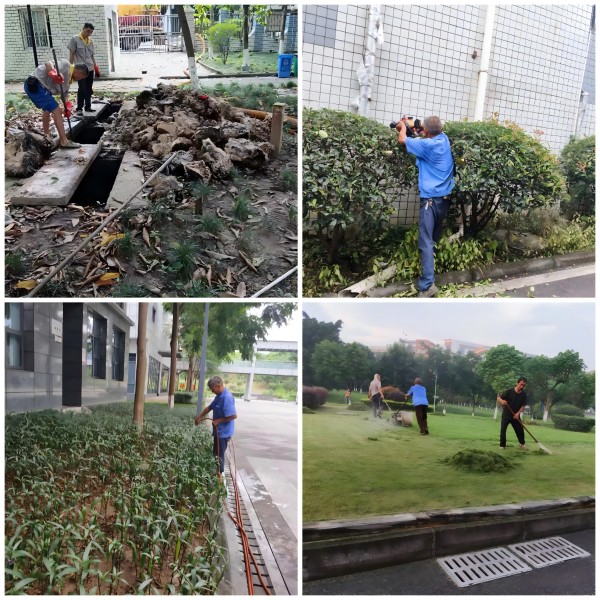 四、校园干净整洁,绿化养护到位。绿化工人们为避开高温时段,早上4点就起来工作,晚上工作到9点才下班,做好了绿植、草坪的高温抗旱、养护、修剪、杂草清理及施肥工作。环卫工人们每天严格按照制度规定做好校园的卫生清扫及垃圾转运工作,在暑期完成了两校区化粪池的定期清掏。环境消杀工人们定期在校园开展灭“四害”和环境消毒消杀工作。极端天气后开展校园巡视,处理自然倒伏树木1次,为倾斜樟树等古树打支撑保护2次,及时排除了安全隐患。