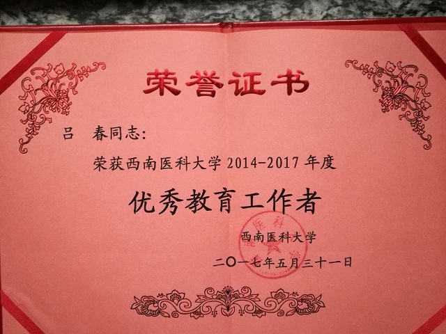 吕春同志荣获kaiyun官方网站入口2014-2017年度优秀教育工作者称号