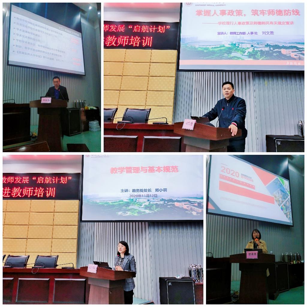 为帮助新进教师了解学校的相关管理制度和业务服务,人事处处长刘文胜介绍了学校人事政策和师德师风建设相关规定;教务处处长郑小莉介绍了教学管理与基本规范;科技处副处长万居易介绍了学校科研政策规定;为帮助和鼓励青年教师开展科学研究,临床医学院梁思成博士为大家做国家自然科学基金申报经验交流分享;图书馆曾果果老师介绍了图书馆馆藏资源和利用。
