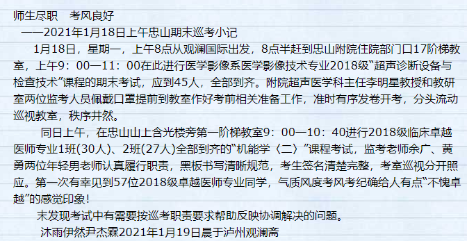 为进一步端正学风、严肃考纪,学校教育评价与教师发展中心组织了校级督导专家对忠山、城北两校区的期末考试工作进行督考。根据情况反馈,各位督导专家对本次考试的组织和考场纪律给予了肯定。其中兼职督导专家组组长尹杰霖(泸州诗词学会会长、关工委常务副主任)除了完成常规的督考工作外,还撰写了题为“师生尽职、考风良好”的督考工作记录。