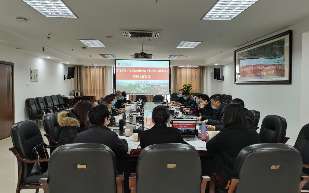 为深入学习贯彻落实中共中央、国务院印发的《深化新时代教育评价改革总体方案》精神,全面推进学校新时代教育评价改革工作,2月3日下午,学校在德诚楼521会议室通过主会场+线上分会场的形式召开了学习贯彻《深化新时代教育评价改革总体方案》培训工作会。学校党委常委、副校长何涛,教育评价改革工作领导组成员在主会场参加会议。各二级院系处级领导干部,教务科、学生科相关同志,教研室主任等通过线上分会场参加会议。