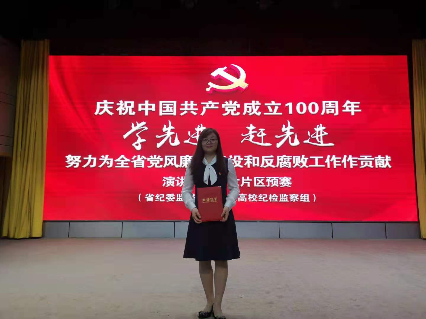 4月27日,全省纪检监察系统“庆祝中国共产党成立100周年——学先进 赶先进 努力为全省党风廉政建设和反腐败工作作贡献”演讲比赛第六片区高校组预赛在四川师范大学举行。全省共有22个派驻省属高校纪检监察组参赛,驻校纪检监察组、校纪委纪检监察室副主任刘珊珊荣获三等奖。