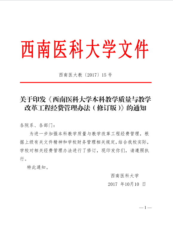 西南医大教〔2017〕15号 《kaiyun官方网站入口本科教学质量与教学改革工程经费管理办法(修订版)》.pdf