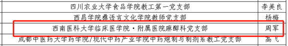 麻醉科教师党支部在临床医学院党委、麻醉学系党总支的直接指导下,积极探索党建与业务“双融双促”,将党建工作与人才培养、学科建设、专业发展、科学研究等深度融合,并主动担当作为、积极服务医学教育及地方经济社会发展,建立了“三型”党支部,形成了“三融三创”支部工作法,培塑出“小麻医生”微科普党建品牌,构建了有鲜明特色的“党建+专业+志愿服务”融合模式和“思政+医疗+实践”育人体系,积极助力麻醉学成为国家级特色建设专业、国家级一流本科建设专业、省级麻醉学教学团队、省级甲级重点学科、四川省临床重点建设专科,获批省级课程思政示范课程1门、省级一流课程2门。支部积极践行为党育人、为国育才,培养学生获得获国家级奖项23项、省级奖项49项,获中国青年志愿项目大赛国家级银奖,获评共青团中国优秀青年志愿者称号1人,多次获评省金奖及铜奖、全省十佳志愿项目、省级思政工作精品项目等。支部成功获批首批四川省高校“双带头人”教师党支部书记工作室并顺利通过验收。