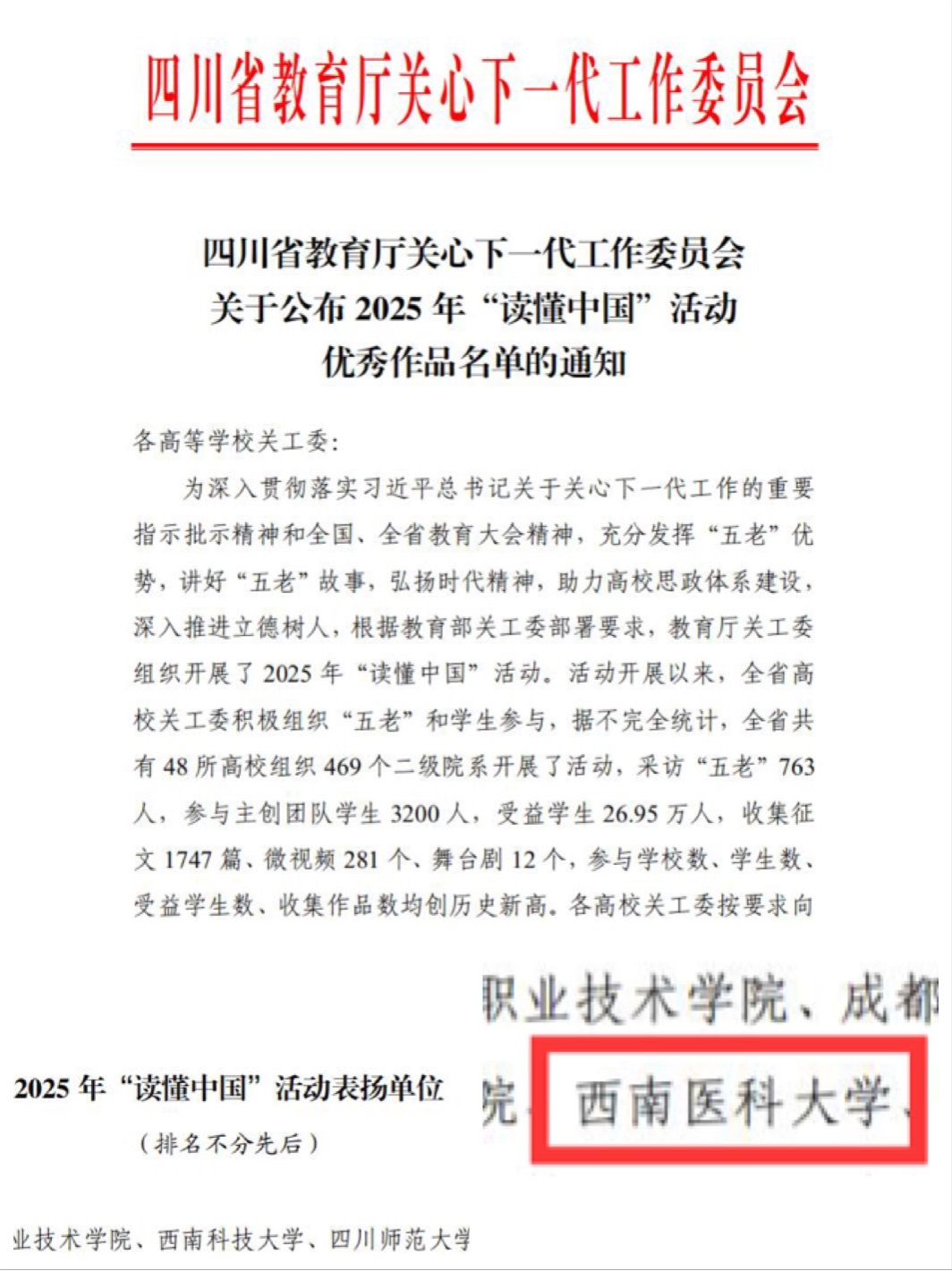 近日,四川省教育厅关工委公布了2025年“读懂中国”活动优秀作品名单。学校关工委推荐选送的2篇征文《以心为灯 照亮医学之路》(基础医学院)、《耕耘不止 俯仰无愧》(人文与管理学院)和2个微视频《医道传承 杏坛育人》(药学院)、《一生一操场》(体育学院)分别获评优秀征文、优秀微视频;学校获评“‘读懂中国’活动表扬单位”。