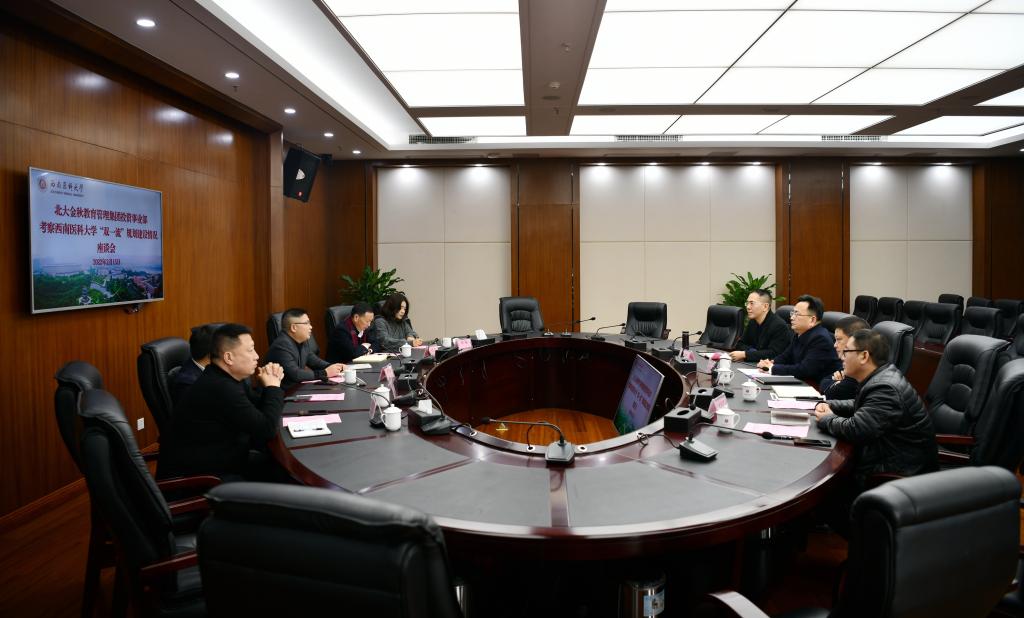 近日,北大金秋教育管理集团投资事业部邹洪波总经理一行5人到kaiyun官网考察“双一流”规划建设情况。座谈会在城北校区德诚楼一会议室举行,学校党委副书记、校长张春祥,泸州市教育和体育局机关党委书记匡子兵参加了座谈。会议由发展规划处处长赵领主持。
