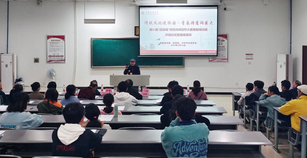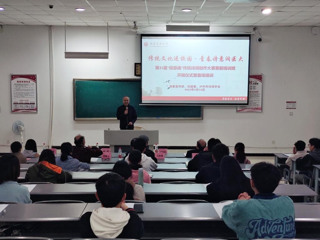 4月16日上午,由学校党委宣传部、校团委、泸州市诗词学会共同举办的“传统文化进校园·青春诗意润医大——第31届‘屈原魂’传统诗词创作大赛赛前培训班”开班仪式暨首场培训在海川楼314教室举行。学校党委常委、宣传部部长柏珂,原党委书记、关工委常务副主任、泸州市诗词学会会长尹杰霖,团委副书记刘玲爽,以及泸州市诗词学会专家代表彭传鼎、雷长诗、马育林、苏金华、申虹云、孙孝莲、刘先泽,学校宝山诗书画院常务副院长皇甫翰深和全校40余名师生参加了开班仪式。开班仪式由党委宣传部文化建设办公室副主任李尘主持。