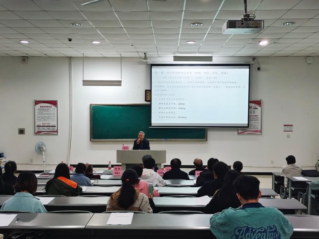 开班仪式后,开展了学校第31届“屈原魂”传统诗词创作大赛赛前培训班首场培训。雷长诗以“传统文化诗词”为题作主题讲座。他一上讲台就声情并茂地吟诵了经典诗词作品,唤起在场师生对传统诗词美的感受。并围绕中国传统诗歌发展的源流、传统诗词学习的方法和途径等,列举详实的诗词押韵、四声、平仄、对仗、声韵运用等鲜活案例,开展了一堂深入浅出的专业知识教学。广大学员纷纷表示,此次讲授内容丰富、生动形象,受益匪浅。