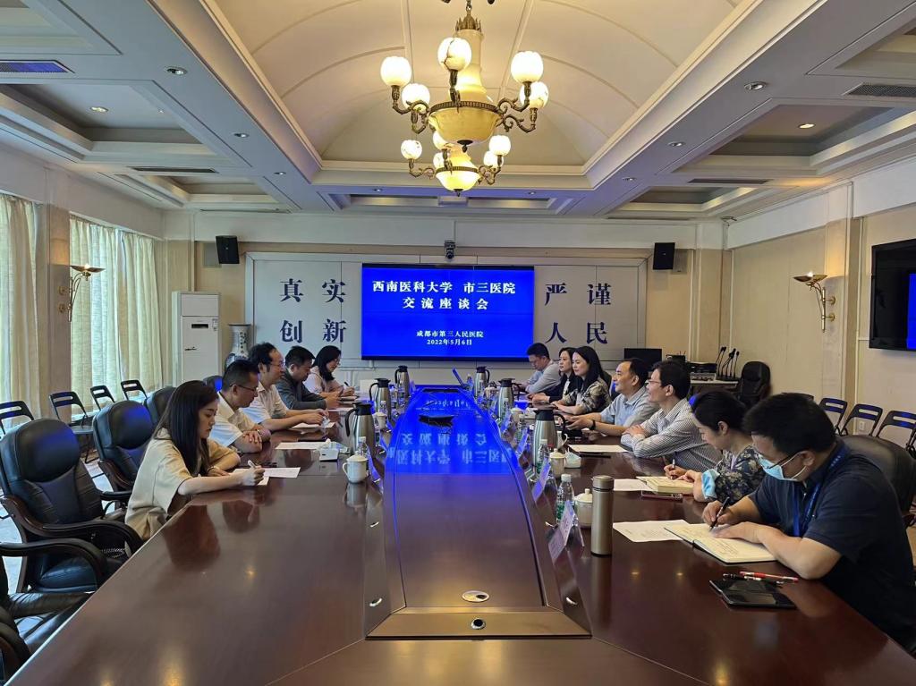聂敏海一行与成都市第三人民医院党委书记徐俊波、院长刘早阳,四川省人民医院副院长曾俊及相关职能部门负责人进行座谈交流。