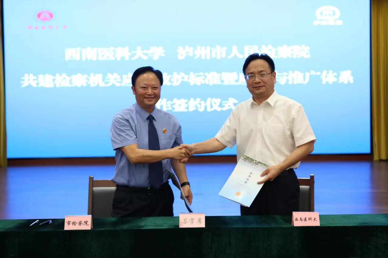 泸州市人民检察院党组书记、检察长刘孝勇与kaiyun官方网站入口党委副书记、校长张春祥共同签署共建检察机关应急救护标准暨应用与推广体系的合作协议。
