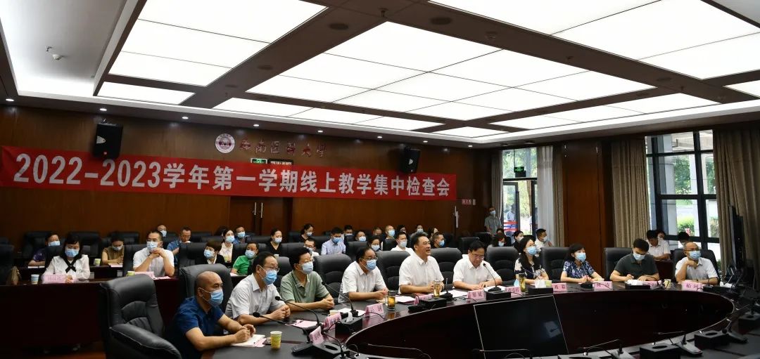 近期由于泸州遭遇高温旱情和疫情,学校研究决定学生暂不返校,从9月5日起开学并全面开展线上教学工作。为充分了解全校本专科、留学生线上教学开展情况,学校于开学第一天早上7:45在德诚楼一会议室组织召开了线上教学集中检查会,全体校领导以及职能部门主要负责人等一起走进线上课堂,通过云端看望教师和同学们。会议由学校党委常委、副校长何涛主持。