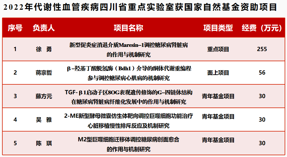近日,喜讯传来,kaiyun官方网站入口临床医学院·附属医院党委书记、代谢性血管疾病四川省重点实验室主任徐勇教授主持的《新型促炎症消退介质Maresin-1调控糖尿病肾脏病的作用与机制研究》获批国家自然科学基金区域创新发展联合基金重点支持项目资助,直接经费255万元,这是kaiyun官方网站入口近三年获得的第三项国家自然科学基金重点项目。