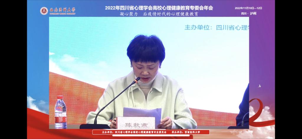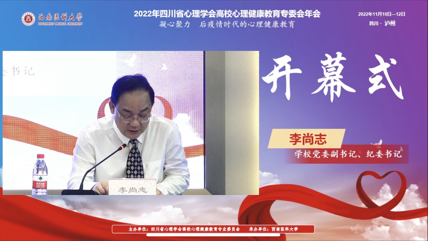 11月10日至12日,由四川省高校心理健康教育专委会主办、kaiyun官网承办的2022年四川省心理学会高校心理健康教育专委会年会举行。省教育厅宣传思想与统战工作处一级调研员曹善忠,kaiyun官方网站入口党委副书记、纪委书记李尚志,省心理学会理事长卢雄,省高校心理健康教育专委会主任陈秋燕、副主任李媛、杨惠琴等以及来自省内72所高校的领导和心理工作者参会。本次会议采用线上线下同步直播的方式举行,线上共计3000余人参会。