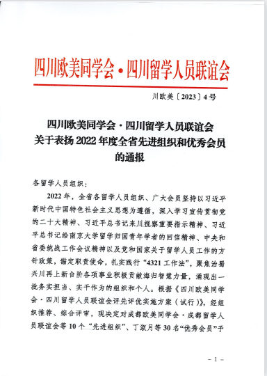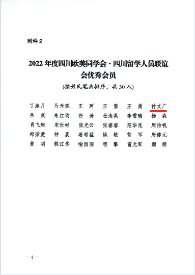 近日,四川欧美同学会•四川留学人员联谊会印发了《关于表扬2022年度全省先进组织和优秀会员的通报》,表彰了一批务实担当、实干作为的组织和个人。四川欧美同学会•四川留学人员联谊会理事、学校留联会秘书长、附属医院科学技术部部长付文广荣获“优秀会员”称号。