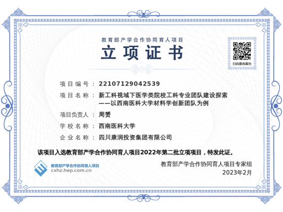 近日,教育部高等教育司下发《关于公布2022年第二批产学合作协同育人项目立项名单的通知》(教高司函〔2023〕1号),医学信息与工程学物理与电子技术教研室教师周赟申报的《新工科视域下医学类院校工科专业团队建设探索——以kaiyun官方网站入口材料学创新团队为例》项目获批立项。
