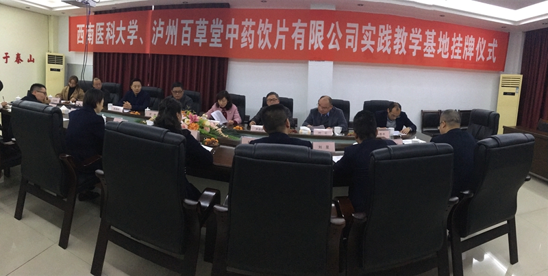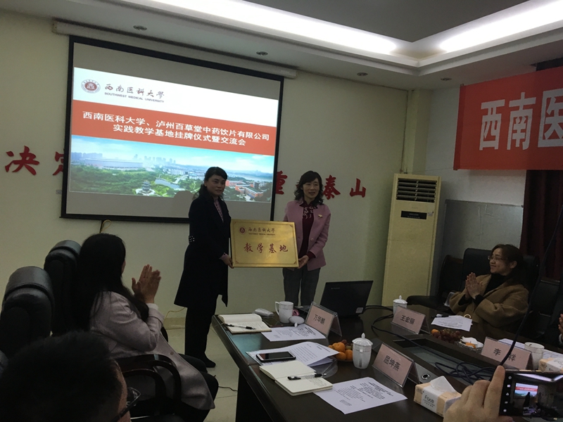 会上,药学院院长叶云,泸州市江阳区副区长罗勇,百草堂董事长王黑梅以及佳乐集团总裁助理刘芳先后致辞,对实践教学基地的揭牌表示祝贺;何涛向王黑梅董事长授予了实践教学基地牌匾。