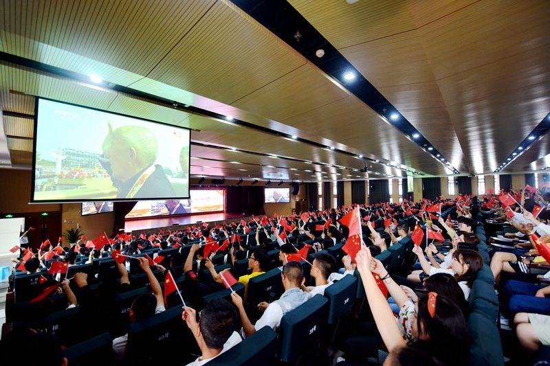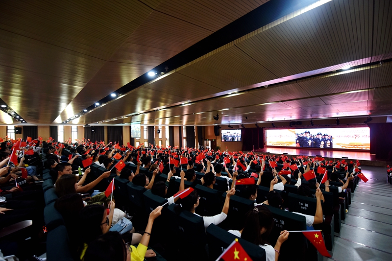上午9:00,学校在城北校区第一学术报告厅组织集中观看庆祝新中国成立70周年大会直播。党委副书记刘毅、学生工作部、校团委全体人员以及各院系分管学生工作领导和学生辅导员、学生代表800余人共同观看。阅兵队伍整齐的阵容、豪迈的气势、先进的武器装备让大家热血沸腾、赞叹不已,整个直播过程师生频频鼓掌、不断喝彩,由衷为祖国的强盛深感自豪与骄傲。