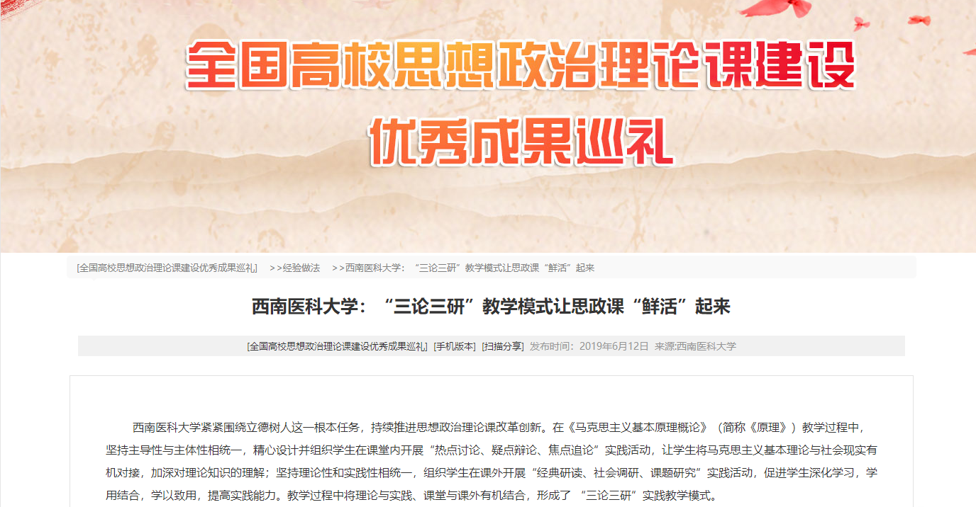 近日,kaiyun官网马克思主义学院马克思主义基本原理概论教研室教学成果《“三论三研”教学模式让思政课“鲜活”起来》在教育部开展的2019年全国高校思政课建设优秀成果巡礼活动中得到专栏展示。