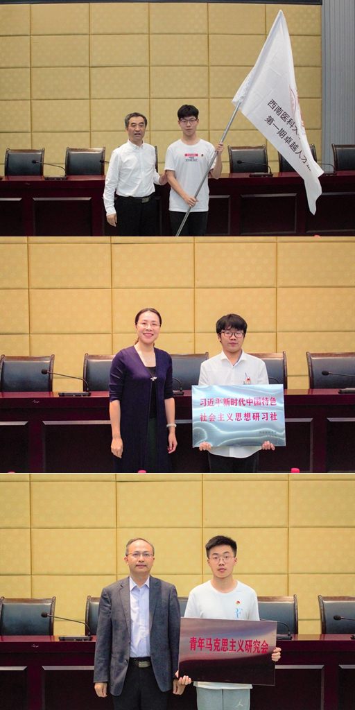 学生工作部部长张碧国为第一期卓越人才班授予班旗,马克思主义学院党总支书记、副院长黄晓利为习近平新时代中国特色社会主义思想研习社授牌,宣传部·统战部部长柏珂为青年马克思主义研究会授牌。