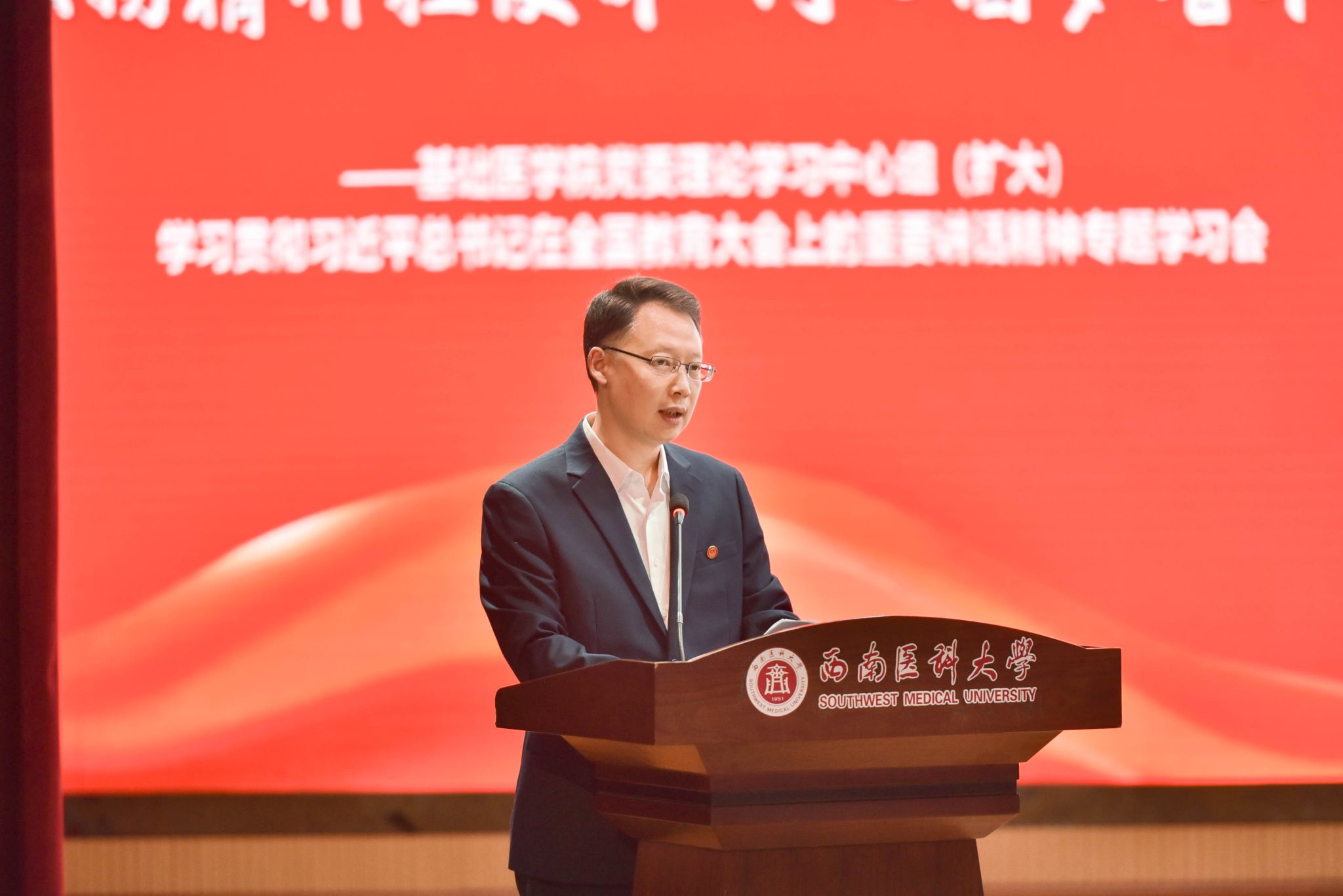 为学习贯彻习近平总书记在全国教育大会上的重要讲话精神,11月14日,学校2024年理论学习示范观摩活动在城北校区第一学术报告厅举行。本次活动以“弘扬精神担使命,同心圆梦谱华章——学习贯彻习近平总书记在全国教育大会上的重要讲话精神 ”为主题,由基础医学院党委理论学习中心组作示范学习。学校党委书记廖斌出席观摩活动,党委常委、副校长何涛以普通党员身份参加专题学习,党委常委、组织部部长柏珂,党委常委、宣传部·统战部部长冯天明以及各二级党组织负责人现场观摩,基础医学院党委理论学习中心组成员、院长、党支部书记、全体无课党员教师参加专题学习。会议由基础医学院党委书记阳静主持。