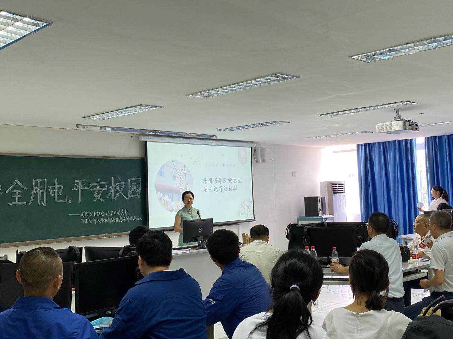 此次共建活动主题为“安全用电,平安校园”。供电党支部的党员们走进校园,为同学们进行安全用电常识宣讲,介绍日常生活中安全用电和防范触电风险的常识。生动地讲解赢得了同学们的阵阵掌声。宣讲过程中,供电党支部的其他党员则走访外国语学院办公区域,对电线电路进行了安全检查。