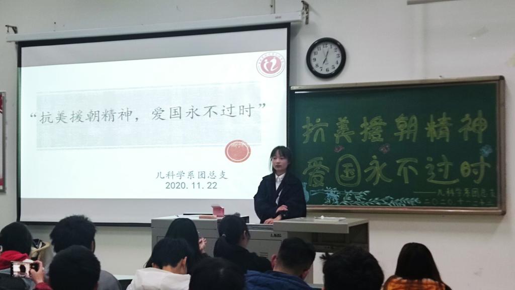为落实共青团中央《关于新形势下推进从严治团的规定》,严格团员教育管理,加强基层团组织建设,提升基层团支部活力,根据《kaiyun官方网站入口关于进一步规范和加强团的组织生活的办法》相关要求,结合抗美援朝出国作战70周年纪念,为弘扬伟大抗美援朝精神,培养广大青年的爱国情怀,儿科学系团总支在海川楼506开展了“抗美援朝精神,爱国永不过时”秋季学期十一月特别主题团日活动。