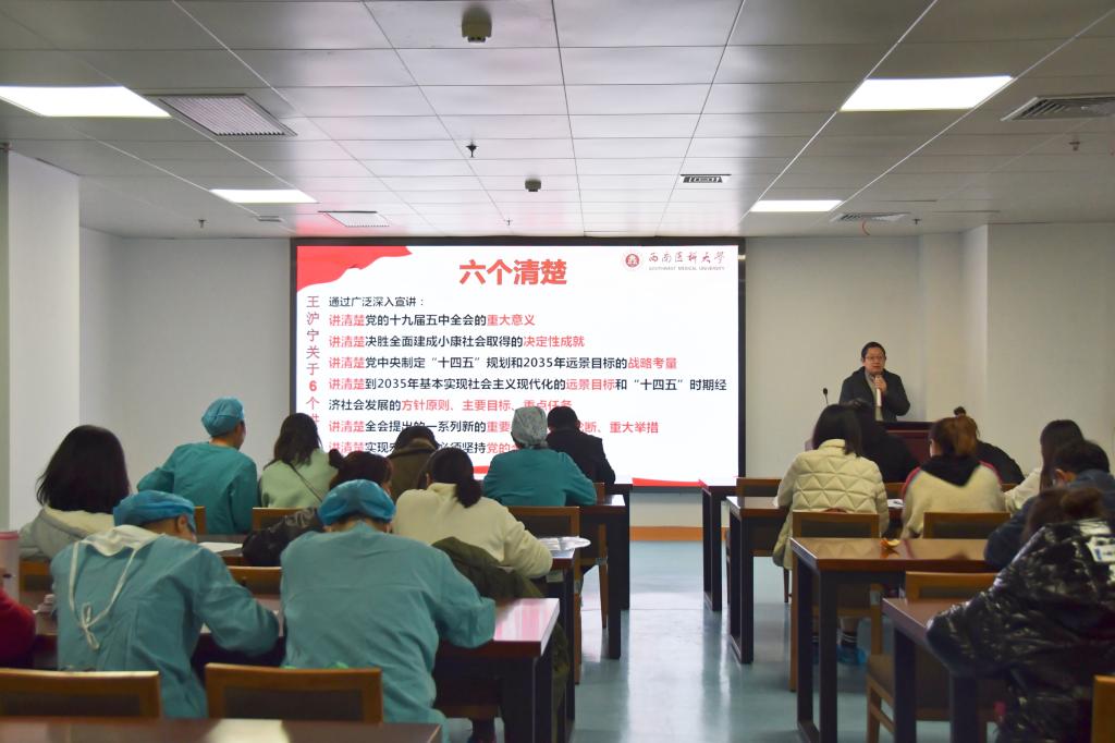 为促进麻醉学系党员深入学习贯彻党的十九届五中全会精神,在学习生活中保持党员先进性。12月2日,麻醉学系党总支开展“学习贯彻党的十九届五中全会精神”专题党课。党课由麻醉学系党总支书记王晓斌主讲,党总支所辖5个党支部全体63名党员参加了此次党课。