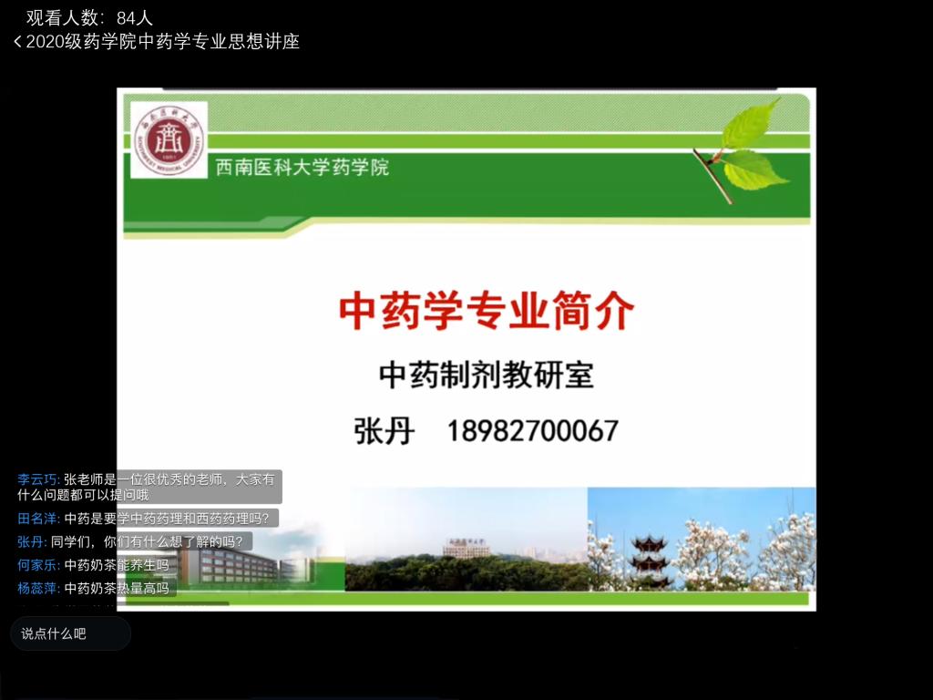 为加深学生对所学专业的认知和了解,12月11日晚,药学院中药炮制与制剂教研室主任、世界中医药学会联合会道地药材多维评价专业委员会委员张丹教授,以《中药学专业简介》为题,为2020级中药学专业学生做了线上专业思想教育专题讲座第二讲。讲座由药学院学生科辅导员李云巧主持。