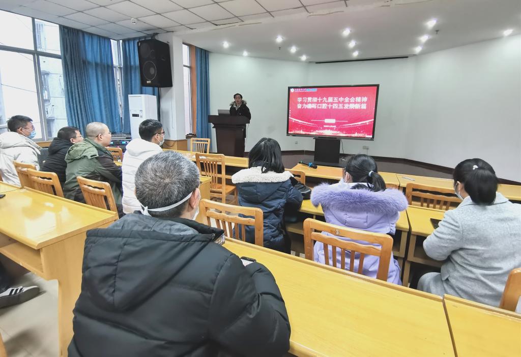 肖金刚从“十九届五中全会会议介绍”“会议关于医疗、教育的论述”“以全会精神为指导,推进医院高质量发展”三个方面生动阐述了十九届五中全会的重大意义和深远影响,进一步结合医疗事业和附属口腔医院发展,对会议精神进行了解读。