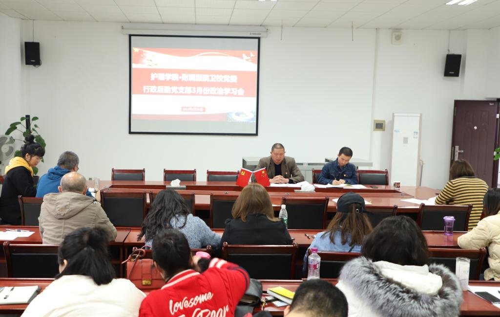 3月25日下午,护理学院•附属医院卫校党委行政后勤党支部在海川楼会议室召开三月份政治理论学习会,院校党委委员、副院长、联系支部处级领导谢长友、行政后勤党支部全体党员和行政后勤管理人员共20多人参加此次学习会。会议由支部书记肖建磊主持。