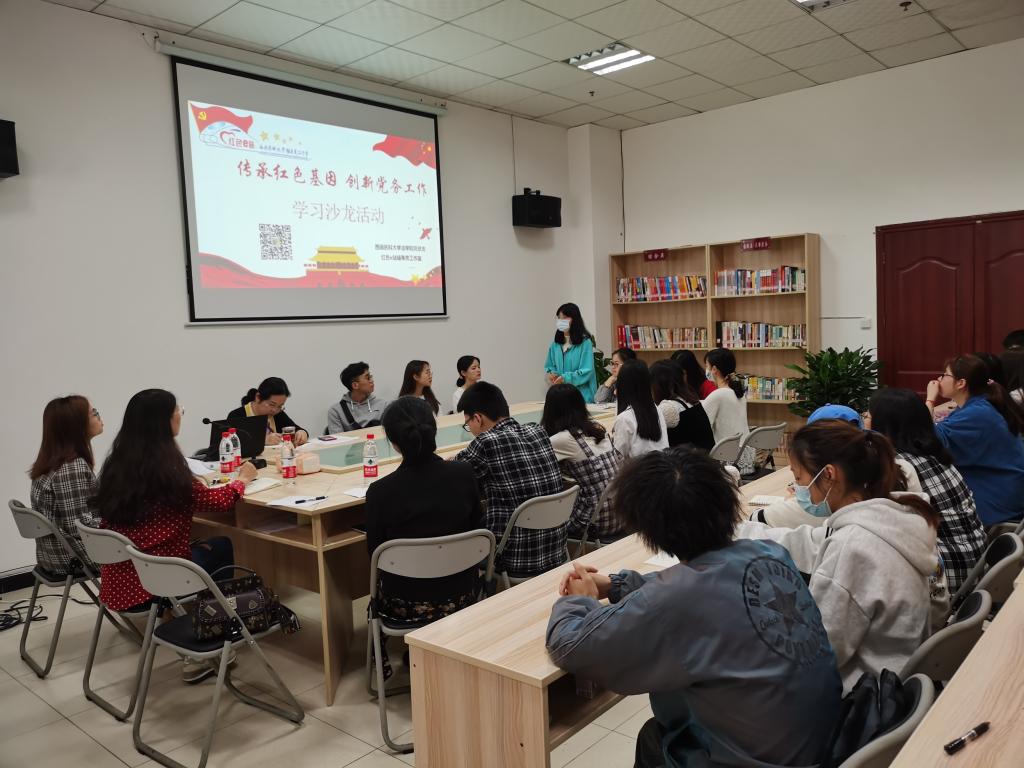 4月22日上午,由法学院党总支、红色e站辅导员工作室联合开展的“传承红色基因 创新党务工作”学习沙龙活动在奥体中心一楼法学院资料室举行。会议由法学院党总支副书记黄莉担任主讲人,法学院分团委书记周婷主持,来自学校12个院系年办的学生党支部书记、辅导员及学生党员干部参加活动。
