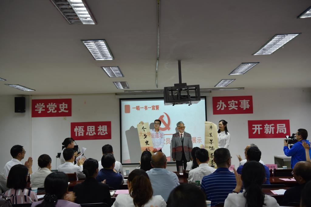 将党史学习教育与艺术熏陶相结合,学出“艺术味”是此次学习活动的一大特色。活动现场,大山坪街道老党员、省级书法家朱玉宝现场书写对联一幅向建党百年献礼,表达自己对党的深情。泸州市四位艺术家激情教唱《坚定信仰跟党走》。