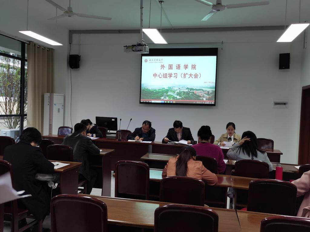 10月21日下午,外国语学院党总支在文渊楼一楼134会议室召开中心组学习,会议由党总支书记周晓昀主持。学院党总支委员、党支部书记、行政科室负责人、教研室(实验室)主任、副主任参加会议。