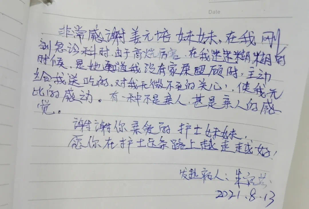 8月13日上午,细菌性肺炎患者朱女士在治愈出院前,在kaiyun官方网站入口附属医院急诊医学部急诊病房护士站对面的“患者留言本”上悄悄手写了一封感谢信,用质朴的文字表达出对姜元培等护士的感激之情。