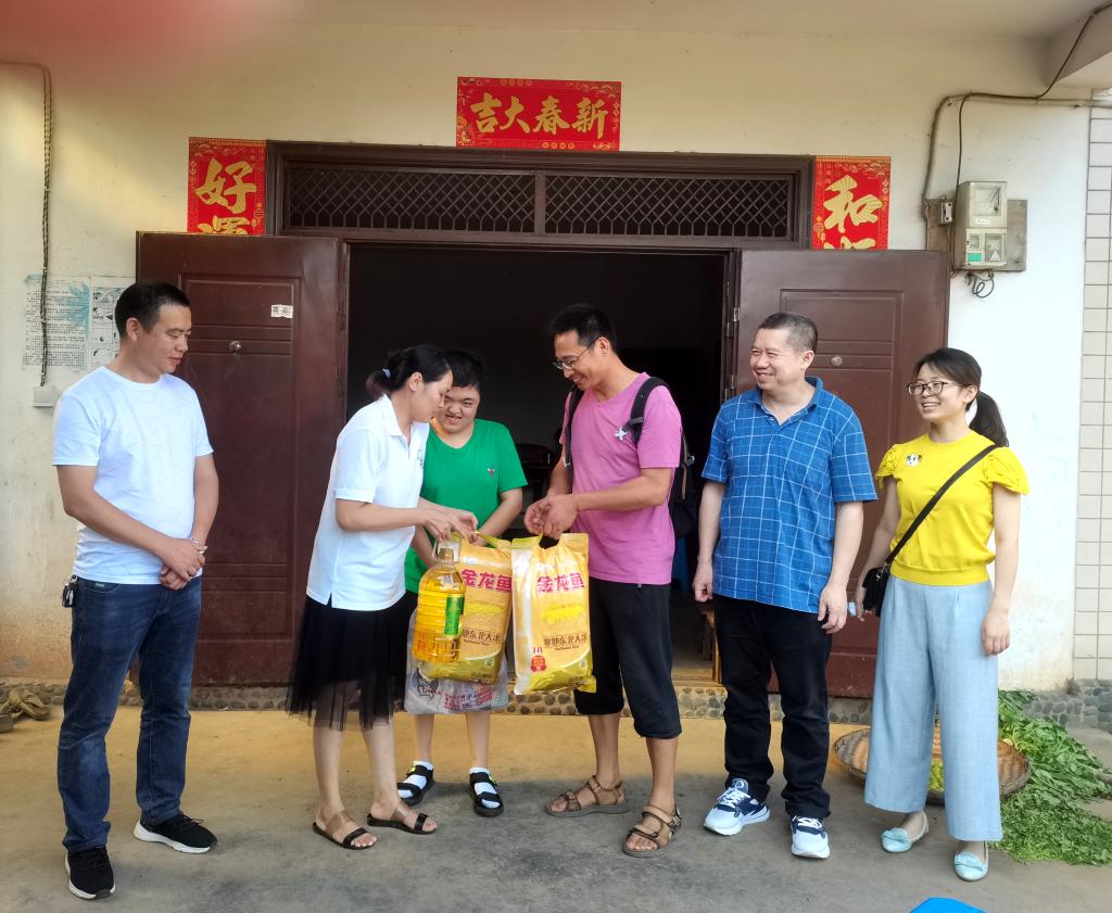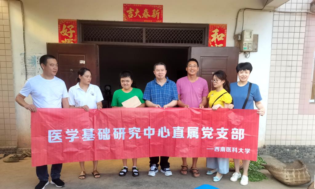 2022年6月20日,kaiyun官网医学基础研究中心党支部、附属医院妇产科杨丽莎医生以及兴隆村村民委员会主任高金海一行5人来到位于泸州市郊的江阳区邻玉街道兴隆村,看望慰问患有先天性双指(趾)并指(趾)畸型的学生李锦湘。